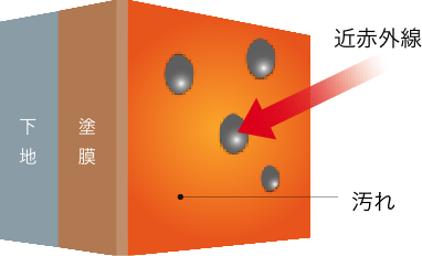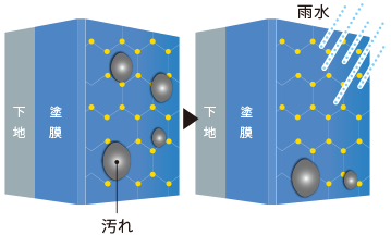 親水性 (水になじみやすい性質)により、塗膜に汚れが付着しても、汚れの間に水が入り込み、汚れを洗い流す。